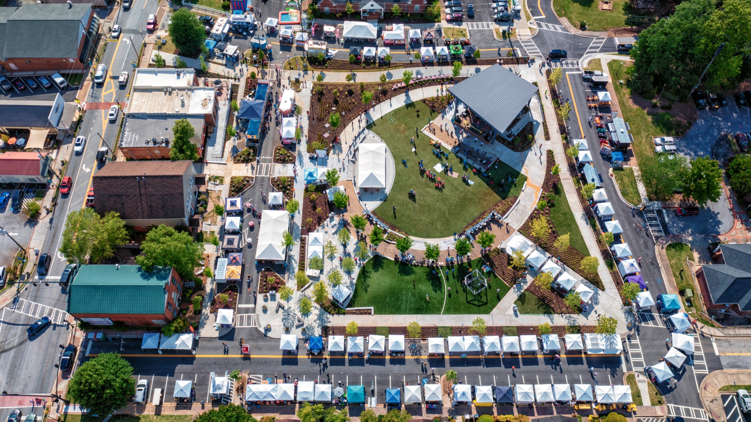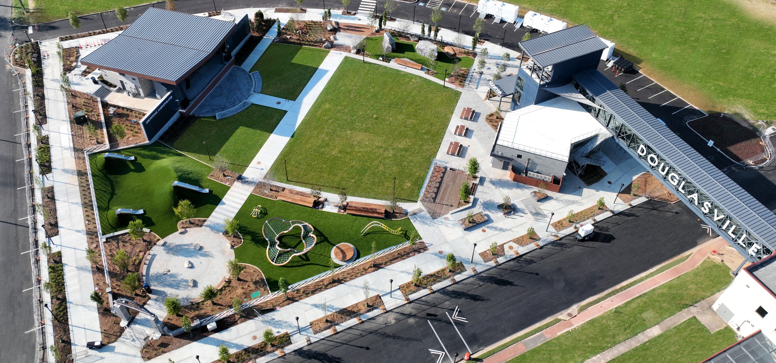 The Douglasville Downtown Greenspace is a 2-acre park designed to accommodate events ranging from community festivals to traveling shows. It features an amphitheater and green room with a flex lawn at the edge of the downtown that is open to the public year-round. The park also includes a building that houses concessions, bathrooms, event spaces, and a rooftop area for visitors to enjoy.