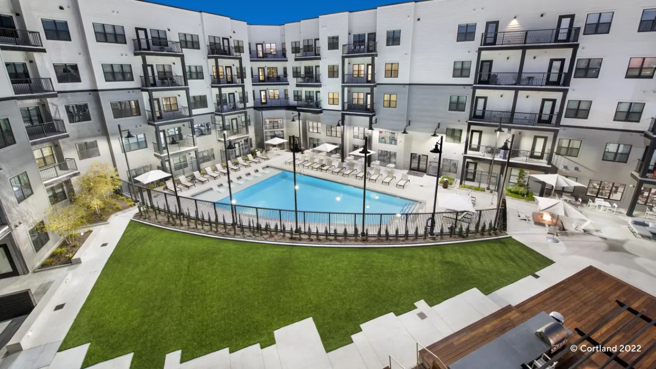 “Block B” amenity spaces included two separate, “U-shaped” courtyards that look over the street below and feature views of the stadium, enclosed on the street side with a glass wall that features a custom “drink ledge.” One courtyard is intended for quieter use, with a lawn, trees in large cor-ten steel planters, and multiple seating options. The larger courtyard is intended for entertainment purposes and features a large trellis with a bartop table, grills, and fireplace.