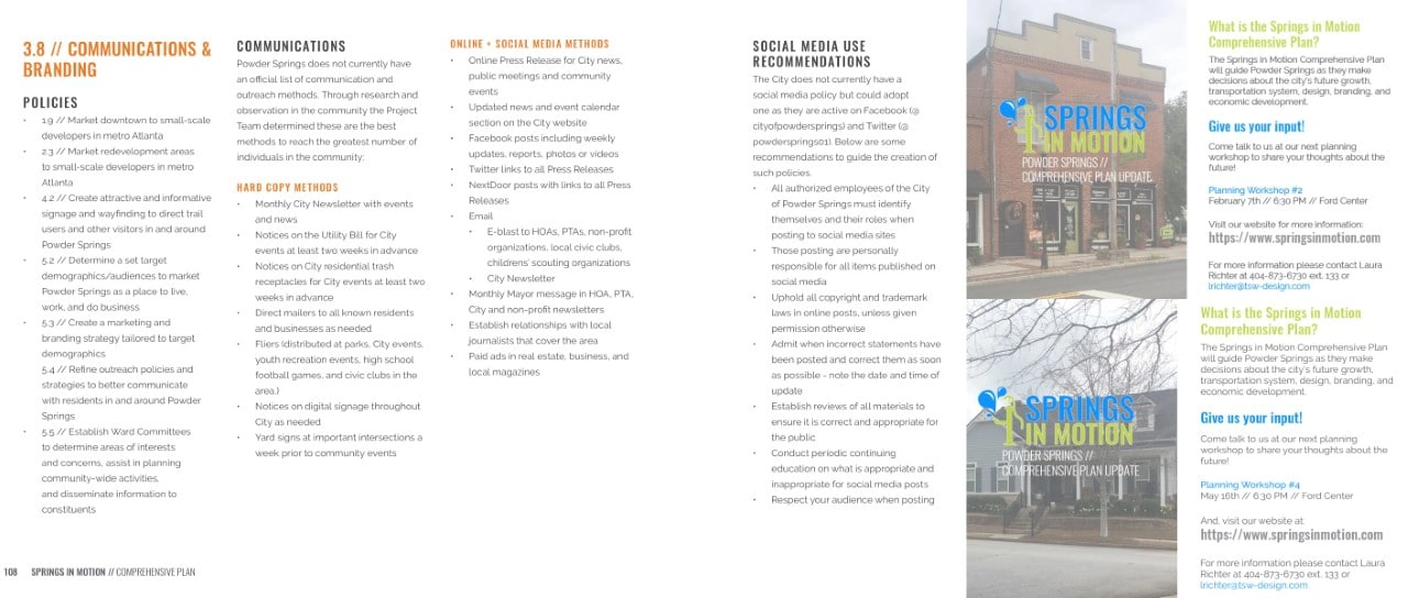 During the branding process, the TSW team asked residents to describe the City of Powder Springs today and how they envision it in the future. Residents described the City as quaint, old, boring, and stagnant, and expressed a desire for it to be seen as progressive, vibrant, lively, and hopeful. To gather feedback on the new branding, the team held a public workshop where they presented different logo ideas to the community. Through feedback from the community and the City, the project team designed two potential logos that reflect the community’s vision for the City as progressive, vibrant, and hopeful, while also incorporating the historic water and pump motif.